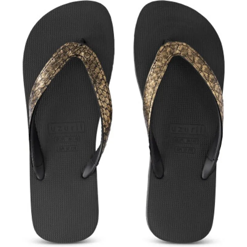 De slippers uit de Sport Collectie kenmerken zich door hun stoere ontwerp. De band is bekleed met echt lederen pythonhuid, die verkrijgbaar is in verschillende kleuren: brons, zwart en taupe. Deze handgemaakte slippers zijn een stijlvol statement piece dat op straat bijzonder in het oog zal vallen. Het experimenteren met edelstenen in talloze vormen, kleuren en texturen is wat onze ontwerpen kenmerkt. De V wordt gedetailleerd met het kenmerkende Uzurii logo over de bandjes. Slippers met open teen en een platte rubberzool. Rubber - PVC – Stenen Zoolhoogte: 1,5cm De V (band): Gemaakt in China Zool: Gemaakt in Brazilië