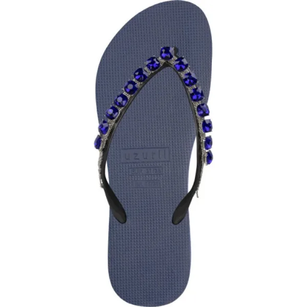 Wist je dat 'Sara' 'vorst' betekent? Daarom worden de Sarah flip flops versierd met koningsblauwe stenen. Koningsblauw is een diepe en levendige tint blauw die een klassieke uitstraling geeft. De zilveren ketting die over de V loopt is een stoer detail. Een elegante, verfijnde slipper met een rauw randje.Onze slippers zijn uniek, handgemaakt en met zorg en liefde ontworpen. De zool, die zijdezacht aanvoelt aan je voet, is gemaakt van rubber. De bandjes zijn gemaakt van PVC. De V kenmerkt zich door het originele Uzurii logo op de bandjes. Onze slippers worden gemaakt in China en BraziliÎ.