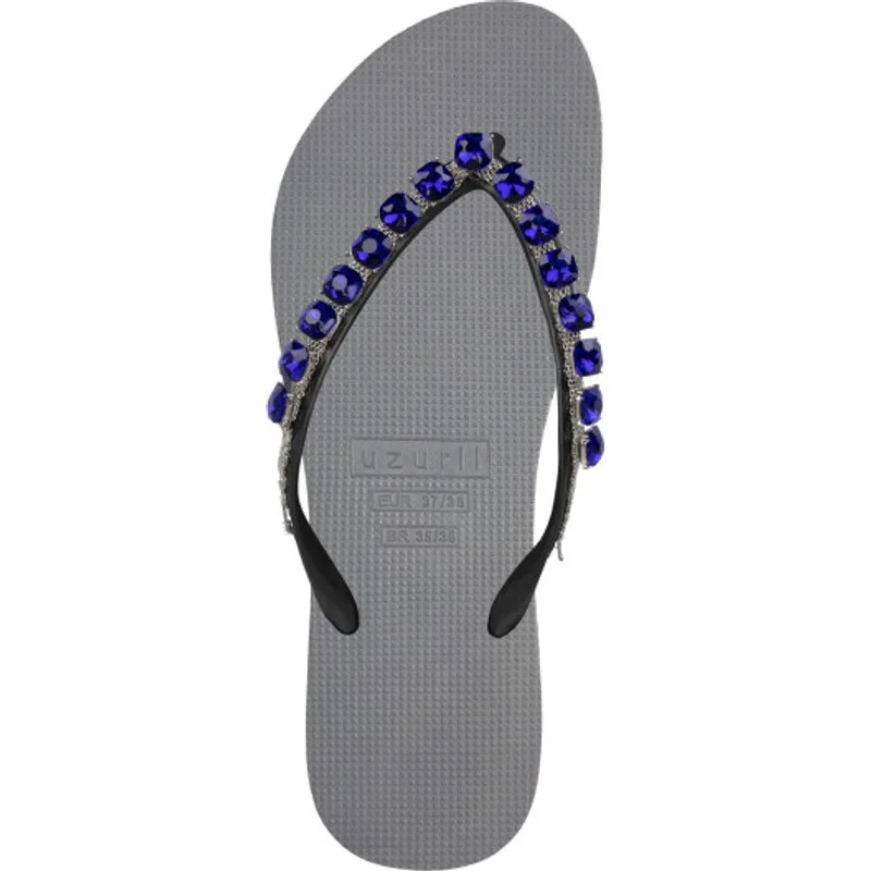 Wist je dat 'Sara' 'vorst' betekent? Daarom worden de Sarah flip flops versierd met koningsblauwe stenen. Koningsblauw is een diepe en levendige tint blauw die een klassieke uitstraling geeft. De zilveren ketting die over de V loopt is een stoer detail. Een elegante, verfijnde slipper met een rauw randje.Onze slippers zijn uniek, handgemaakt en met zorg en liefde ontworpen. De zool, die zijdezacht aanvoelt aan je voet, is gemaakt van rubber. De bandjes zijn gemaakt van PVC. De V kenmerkt zich door het originele Uzurii logo op de bandjes. Onze slippers worden gemaakt in China en BraziliÎ.