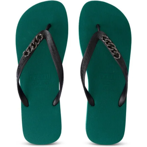 De slippers uit de Sport Collectie kenmerken zich door hun stoere ontwerp. De band is gedeeltelijk bedekt met een forse zilveren ketting. Deze handgemaakte slippers zijn een stijlvol statement piece dat op straat bijzonder in het oog zal vallen. Het experimenteren met edelstenen in talloze vormen, kleuren en texturen is wat onze ontwerpen kenmerkt. De V wordt gedetailleerd met het kenmerkende Uzurii logo over de bandjes. Slippers met open teen en een platte rubberzool. Rubber - PVC – Stenen Zoolhoogte: 1,5cm De V (band): Gemaakt in China Zool: Gemaakt in Brazilië