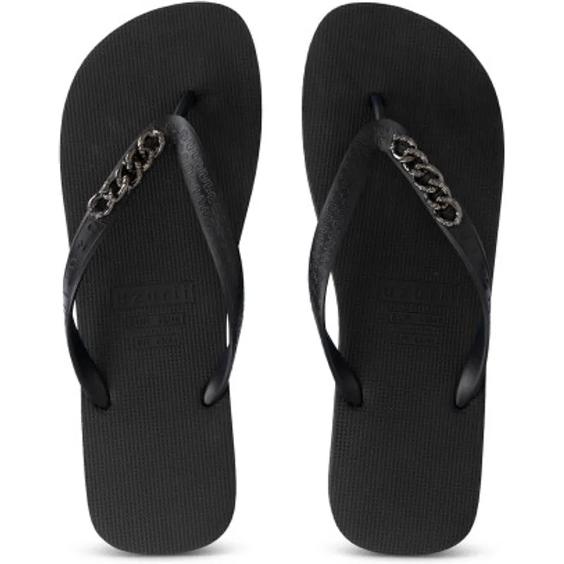 De slippers uit de Sport Collectie kenmerken zich door hun stoere ontwerp. De band is gedeeltelijk bedekt met een forse zilveren ketting. Deze handgemaakte slippers zijn een stijlvol statement piece dat op straat bijzonder in het oog zal vallen. Het experimenteren met edelstenen in talloze vormen, kleuren en texturen is wat onze ontwerpen kenmerkt. De V wordt gedetailleerd met het kenmerkende Uzurii logo over de bandjes. Slippers met open teen en een platte rubberzool. Rubber - PVC – Stenen Zoolhoogte: 1,5cm De V (band): Gemaakt in China Zool: Gemaakt in Brazilië