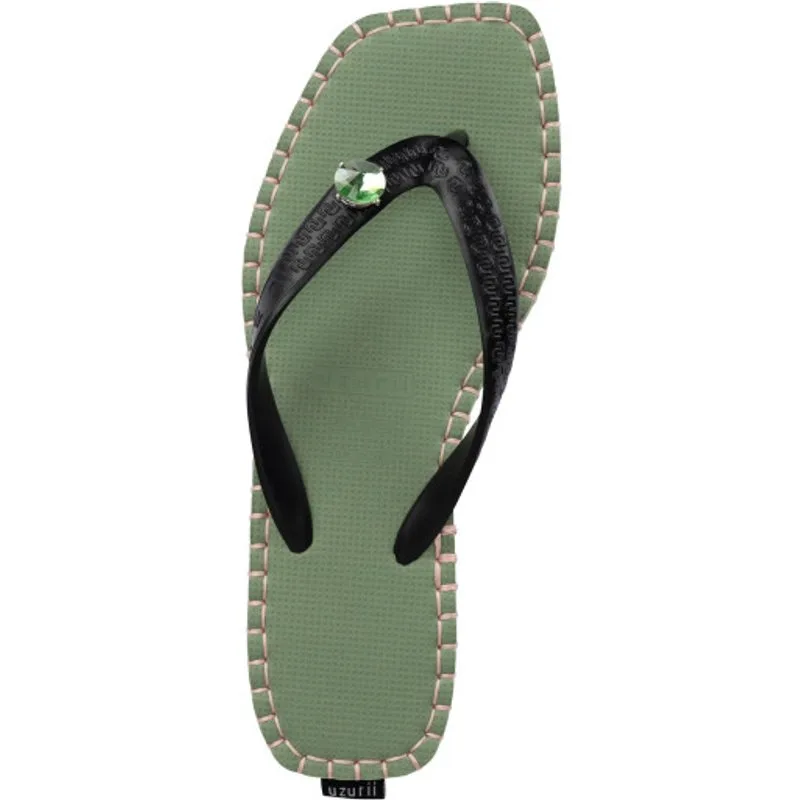 De Stitched by Es Green slipper kenmerkt zich door haar stoere, vierkante zool en stiksels. 'Edgy' en 'sophisticated' beschrijven deze flip flops perfect! De zwarte plateauzool is elegant en makkelijk te combineren. Door de druk knop op de V, kun je de switch button makkelijk zelf verwisselen. Kies uit een groot aantal stenen uit onze accessoirelijn. Zo tover je jouw paar flip flops eenvoudig om tot een nieuwe look!Onze slippers zijn uniek, handgemaakt en met zorg en liefde ontworpen. De zool, die zijdezacht aanvoelt aan je voet, is gemaakt van rubber. De bandjes zijn gemaakt van PVC. De V kenmerkt zich door het originele Uzurii logo op de bandjes. Onze slippers worden gemaakt in China en BraziliÎ.
