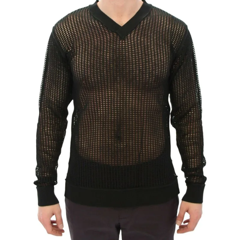 Verhoog je stijl, omarm het seizoen. Deze Dolce & Gabbana trui biedt moeiteloze verfijning en warmte. Gemaakt van ademend katoen in een stijlvolle zwart netbrei, biedt het comforttechnologie voor een hele dag. Het V-halsontwerp zorgt voor een moderne, verfijnde uitstraling, terwijl de lange mouwen zorgen voor een gezellige bedekking. Geniet van duurzame, onderhoudsarme draagbaarheid door de gemakkelijk te onderhouden constructie. Perfect voor lagen of om alleen te dragen, integreert deze trui naadloos in je herfst- en wintergarderobe en voegt een vleugje luxe toe aan iedere gelegenheid.