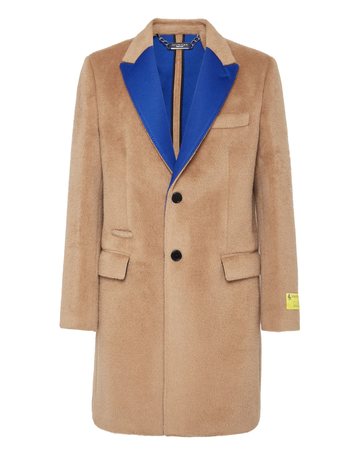 Eenvoud verbergt een paar verrassingen. Bekijk deze wollen overjas met een zeer ongebruikelijk detail. Stof van wol en lamawol Hoge revers gevoerd met contrastkleurig gaas Tweeknoopsfront Twee zakken met kleppen Binnenvoering