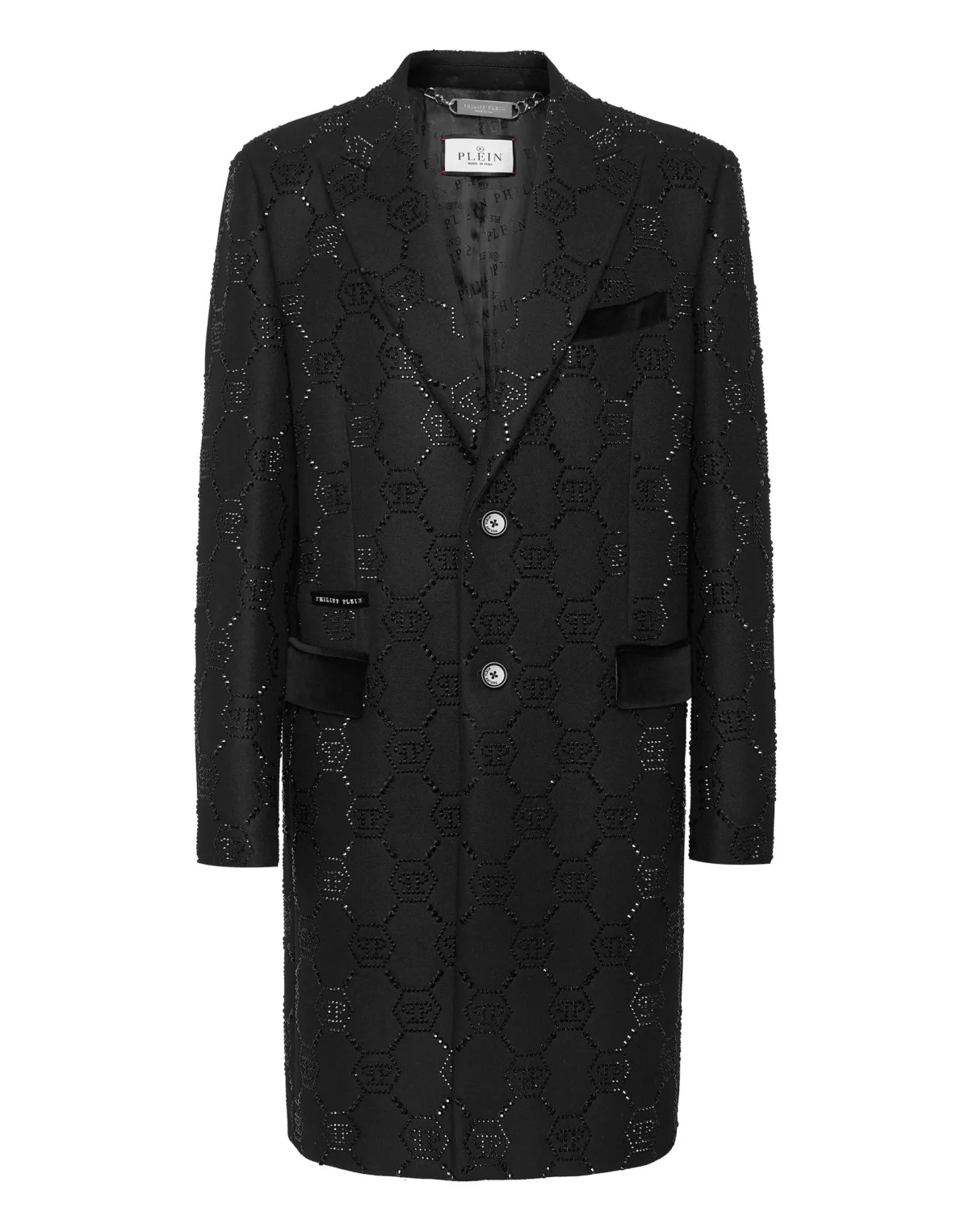 Full round originality. Check out this woolen overcoat featuring pure Plein details. Wool blend fabric All over Schmucksteinbesetzter logo Peak lapel Two buttons Two flap pockets Double vent Satin lining