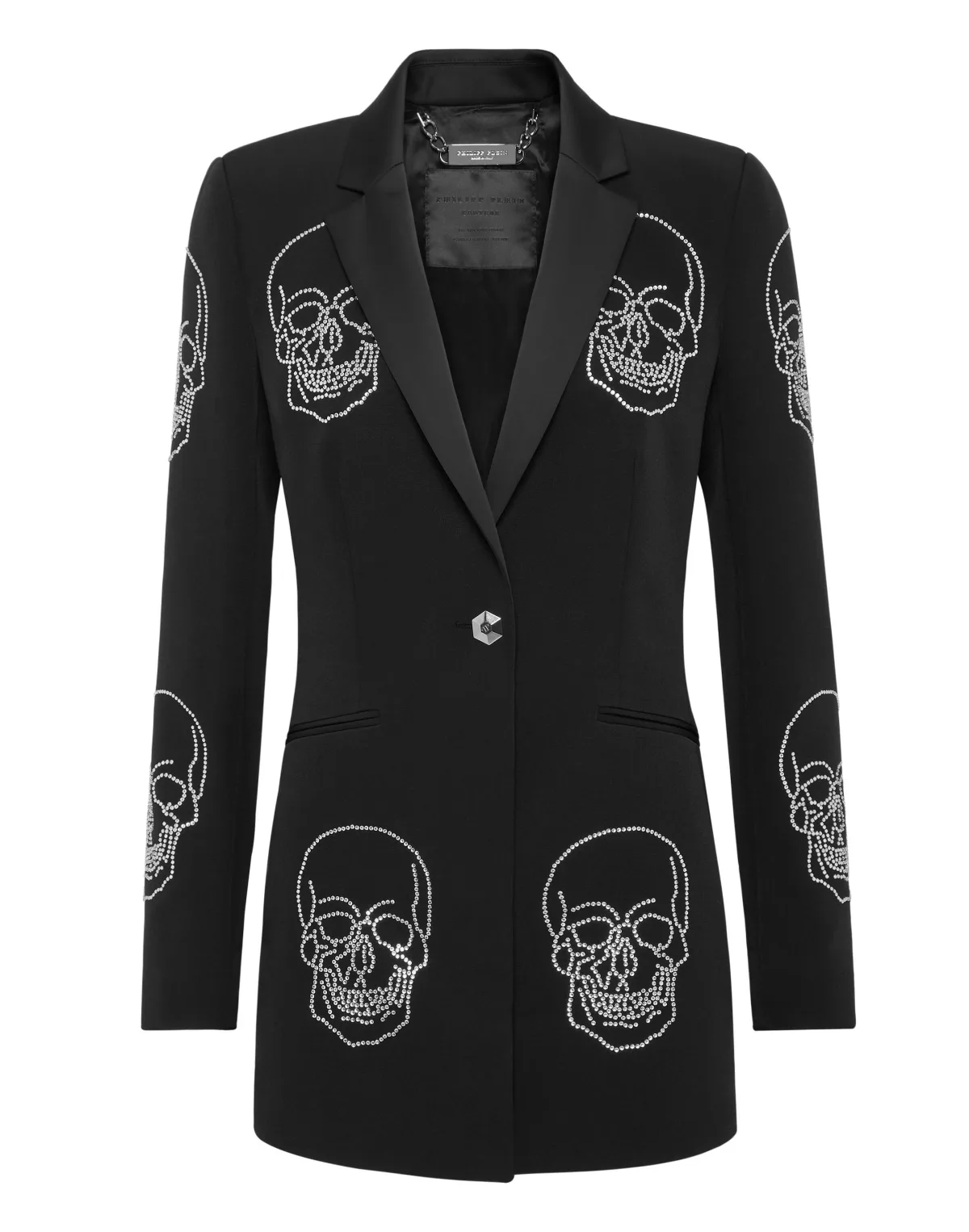 De eenvoudige lijnen van dit wollen crêpe jasje worden tegengesproken door de iconische kristallen schedel die all-over is gedrukt. Standaard revers gevoerd met satijn. Enkele metalen zeshoekige knoopsluiting. Twee steekzakken. Binnenvoering.