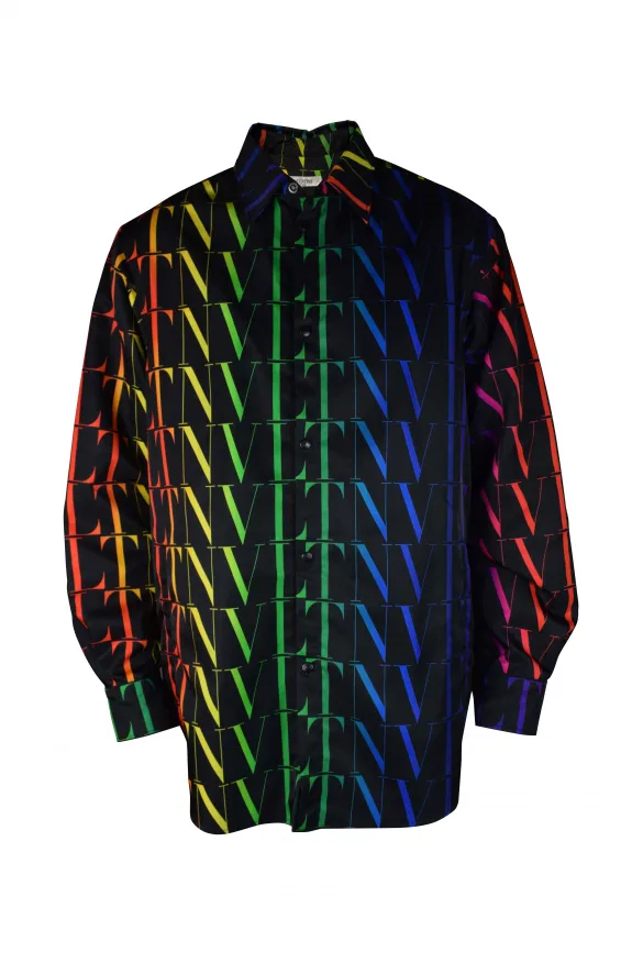 Valentino Oversize jasje in overhemdstijl.Veelkleurig VLTN -logo op zwarte achtergrond.Knoop aan de voorkant en mouwen.Klassieke kraag.Lange mouwen.100% polyamide.Gemaakt in Italië.