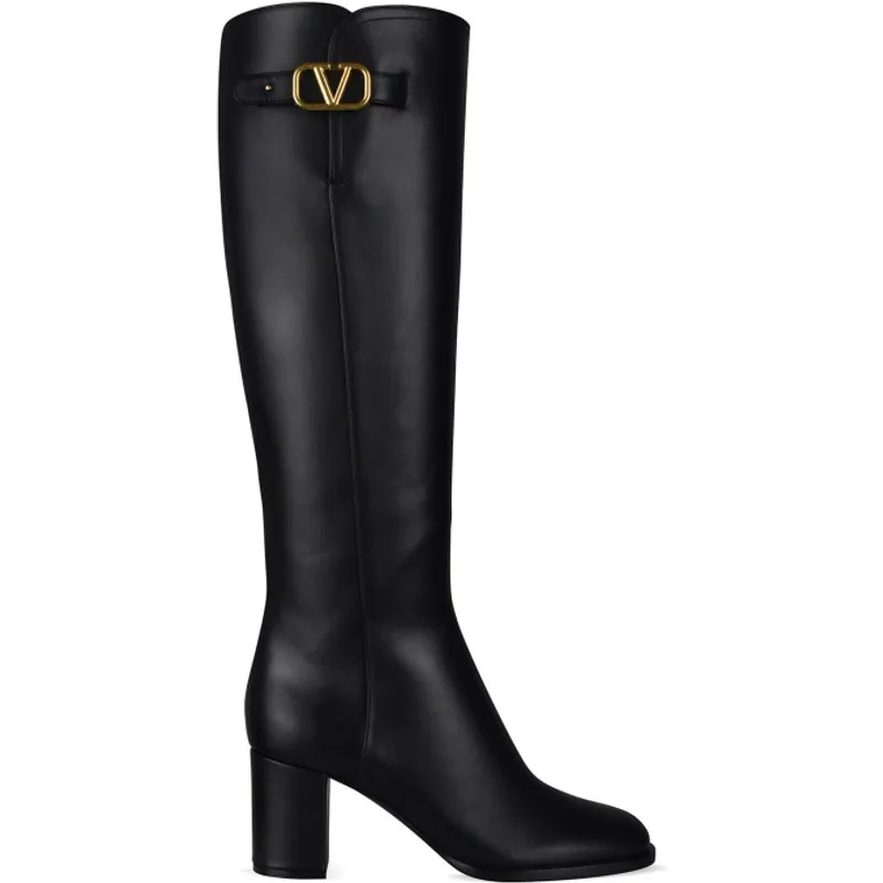 Valentino Garavani VLogo laarzen van zwart kalfsleer.Vergulde VLogo kenmerkende gesp aan de bovenkant.Amandelvormige neus.Zijritssluiting.Vierkante hak van 7 cm.Gemaakt in Italië.