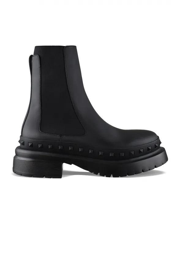 Valentino M-Way Rockstud Chelsea boots van zwart leer.Zwarte decoratieve studs rond de zool.Leren tong aan de achterkant.Dikke zwarte zool van 5 cm.Afgeronde neus.Made in Italy.