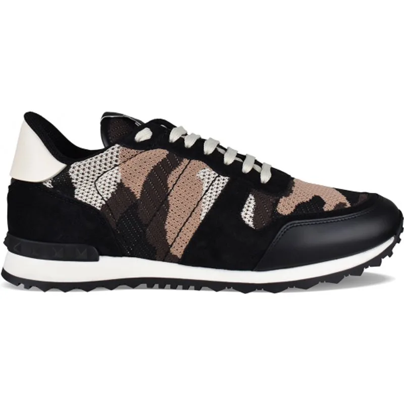 Rockrunner camouflage sneakers van Valentino in zwart, wit en bruin.Suède, leer en canvas.Decoratieve rubberen noppen. Witte lederen zool.Rubberen gekerfde zool. Vetersluiting. Gemaakt in Italië.