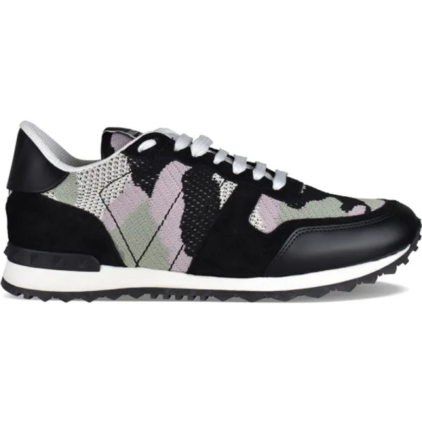 Valentino Rockrunner camouflage sneakers in zwart, groen en roze.In stof, suède en leer.Decoratieve rubberen noppen.Zwart lederen zool.Rubberen gekerfde zool. Vetersluiting.Gemaakt in Italië.
