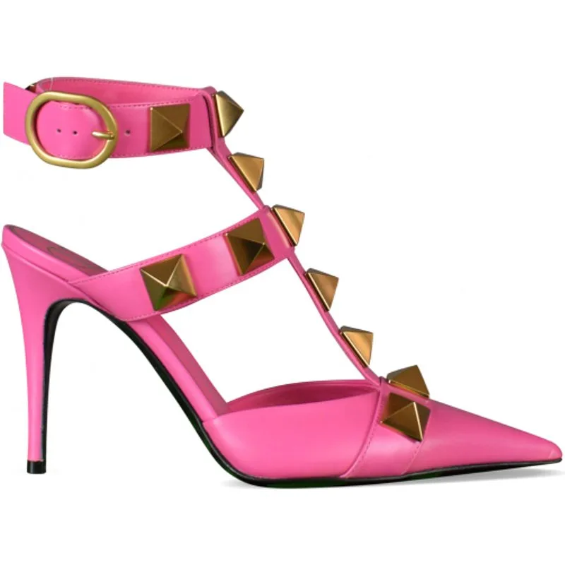 Valentino Garavani Roman Stud-pumps van roze kalfsleer.Band met grote studs.Grote 18 mm studs met verouderde messing afwerking.Verstelbaar enkelbandje met grote gesp.Hakhoogte: 10 cm.100% kalfsleer.Gemaakt in Italië.