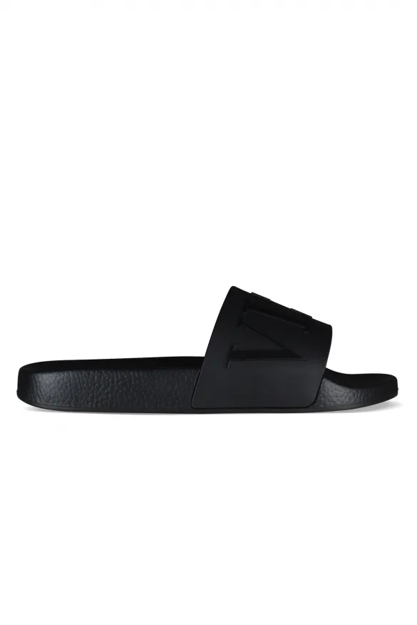 Valentino VLTN-slippers.Zwart rubber.Handtekening VLTN zwart logo in reliëf.Zwarte rubberen zool.Gemaakt in Italië.