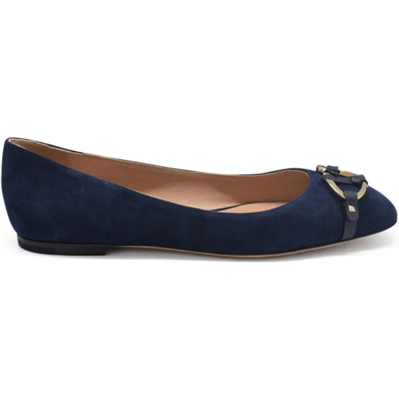 Valentino ballerina in marineblauw suède met afgeronde vierkante neus. Valentino-logo met gouden plaat en marineblauw leer. Hak van 0,5 cm. Gemaakt in Italië.