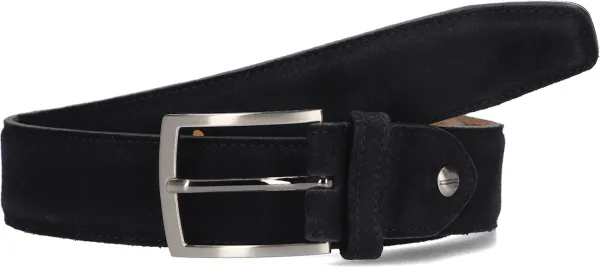 Stijlvolle riem 10001-41-03 voor heren uit de collectie van het Nederlandse merk Van Bommel. Deze riem is gemaakt van suède en heeft een natuurlijk leren voering aan de binnenkant. De riem is 3,5 cm breed. Een zilveren gesp en een subtiel metalen Van Bommel-button maken de riem helemaal af. Kleur: donkerblauw.Riemen van het merk Van
