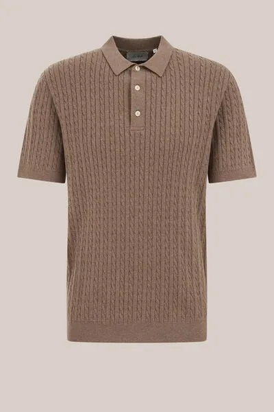Kies voor klasse en karakter. Deze gebreide polo heeft een regular fit, een kraag met halve knoopsluiting, korte mouwen en een opvallende kabelstructuur.