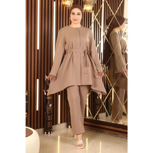 Stofkenmerk: Gemaakt van dubbele stof. Productkenmerk: Het is een nieuwe seizoen hijab modeproduct en is niet gevoerd. De tuniek heeft verborgen knopen die van voren kunnen worden gebruikt. De mouwen zijn uitlopend. De stenen op de manchetten zijn bedrukt. De riem is afneembaar. De broek heeft een elastische taille. De productkleur kan verschillen door conceptfoto's. Het model draagt maat 38. Maat 38 Tuniekafmetingen: Productlengte: 82 cm - Borst: 102 cm - Taille: 120 cm - Heupen: 150 cm Maat 38 Broekafmetingen: Productlengte: 95 cm - Taille: 78 cm - Heupen: 98 cm Maatafmetingen stijgen met 3 of 4 cm. (Productlengte verandert niet)