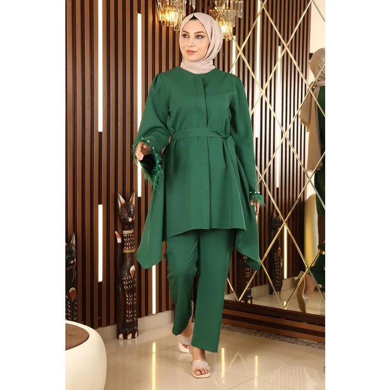Stofkenmerk: Gemaakt van double stof. Productkenmerk: Het is een nieuw seizoen hijab modeproduct en is niet gevoerd. De tuniek heeft verborgen knopen die van voren kunnen worden gebruikt. De mouwen zijn klokvormig. De steentjes op de manchetten zijn bedrukt. De riem is afneembaar. De broek heeft een elastische taille. De productkleur kan afwijken door conceptfoto's. Het model draagt maat 38. Maat 38 Tuniekmetingen: Productlengte: 82 cm - Borst: 102 cm - Taille: 120 cm - Heupen: 150 cm Maat 38 Broekmetingen: Productlengte: 95 cm - Taille: 78 cm - Heupen: 98 cm Maatmetingen nemen toe met 3 of 4 cm. (Productlengte verandert niet)