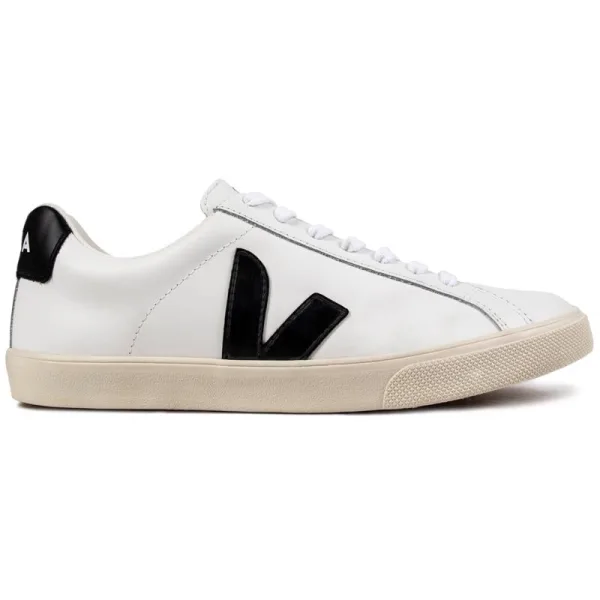 Witte Veja Esplar damessneakers met veters en bovenwerk van premium leer met iconisch V-logo in zwart en bijpassend hielstuk met merklogo. Deze damessneakers zijn Braziliaans gemaakt van milieuvriendelijke en duurzame materialen. met een voering en binnenzool van biologisch katoen. en een rubberen zool.