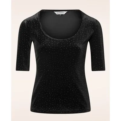 ”Life is short, so make it glitter!” Straal als nooit tevoren in deze fluwelen glitter top. Ze is uitgevoerd in een soepel en stretchy stofje met de looks and feel van fluweel en voorzien van een zilver glittertje. * Diepe ronde halslijn * Korte mouwen * Lang genoeg om op een normale heupbroek te dragen