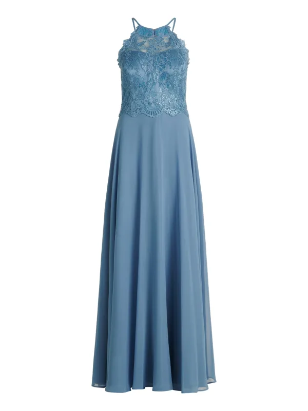Design: Gevoerde zoom/rand; Type sluiting: Ritssluiting; Materiaal: Chiffon, Tule; Halstype: Ronde hals; Motief: Effen; Soort bandjes: Haltermodel; Details: Cut-outs, Pailletten, Kant; Extra's: Op staal naden; Lengte: Lang/maxi; Snit: Getailleerd; Pasvorm: Normale pasvorm; Armlengte: Mouwloos
