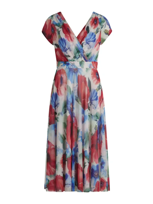 Design: Rechte zoom, Rug rits; Type sluiting: Ritssluiting; Halstype: Wikkeltop; Motief: Bloemenprint; Details: Gedrapeerd; Extra's: All-over patroon, Gladde stof; Lengte: Knielengte; Snit: Getailleerd; Pasvorm: Normale pasvorm; Armlengte: Kwartmouw