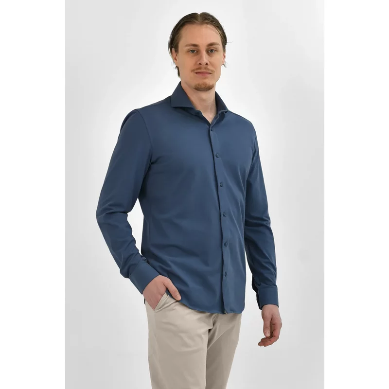 Dit strijkvrije blauwe overhemd combineert elegantie met ongeëvenaard comfort. Gemaakt van hoogwaardig piqué katoen, biedt de Japanese Knitted stof een subtiele structuur, voelt zacht en soepel aan, en beweegt moeiteloos mee. De cutaway kraag en slim fit pasvorm zorgen voor een moderne uitstraling. Dankzij de ademende stof blijft het overhemd de hele dag fris, zonder dat strijken nodig is. Het effen design maakt het veelzijdig en geschikt voor zowel formele als informele gelegenheden.