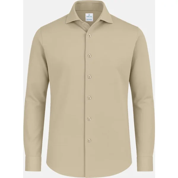 Dit strijkvrije beige overhemd combineert luxe en comfort. De Japanese Knitted stof, gemaakt van hoogwaardig piqué katoen, voelt zacht en soepel aan en biedt natuurlijke stretch. De slim fit pasvorm sluit mooi aan en zorgt voor een moderne uitstraling.