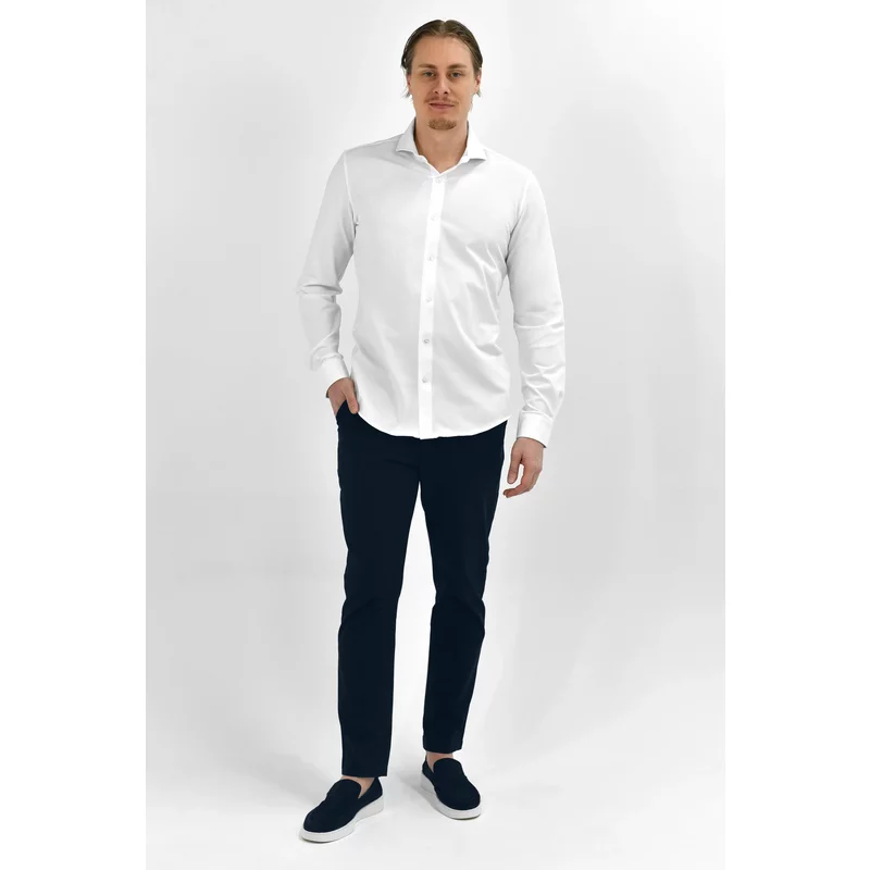 Dit strijkvrije witte overhemd is de perfecte mix van luxe en gemak. Gemaakt van hoogwaardig piqué katoen, voelt zacht aan en biedt een subtiele structuur met optimale ademing. De cutaway kraag en slim fit pasvorm bieden een comfortabele, elegante fit. Een tijdloze essential die elke dag perfect zit.