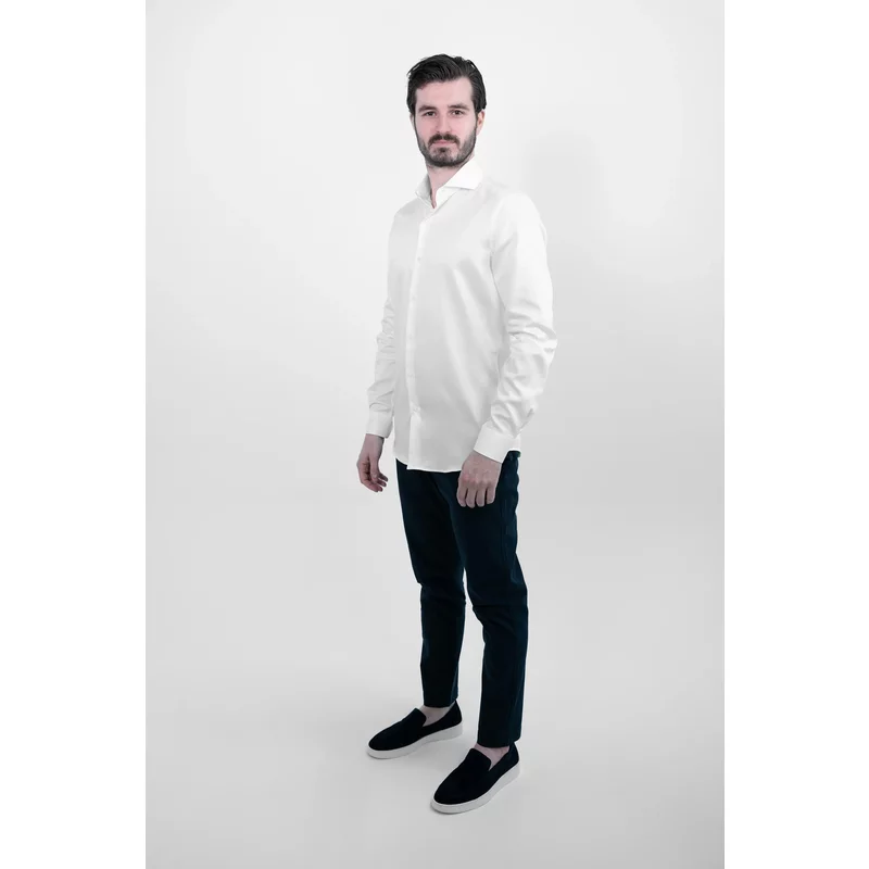 Een mooi strijkvrij overhemd gemaakt van 100% satijn geweven katoen. Dit overhemd is goed ventilerend en vocht absorberend door het natuurlijke katoen satijn. Door onze slim fit pasvorm valt het overhemd mooi getailleerd op iedere gewenste maat. Geschikt om zowel zakelijk als formeel te dragen en afgemaakt met een strakke cut away kraag.