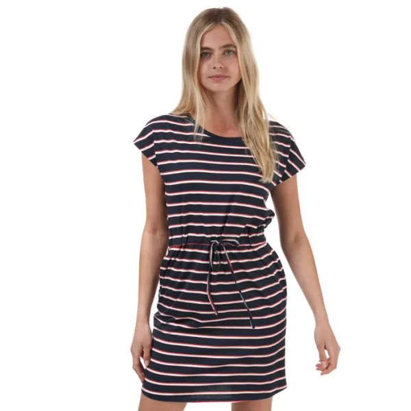 Vero Moda April gestreepte jurk voor dames, marineblauw. - Ronde hals. - Casual T-shirtjurk van zacht katoenjersey. - Korte mouwen. - Trekkoord van hetzelfde materiaal in de taille voor een flatterende pasvorm. - Zakken in de zijnaad. - Volledig gestreept. - Losse pasvorm. - 100% katoen. Wasmachinebestendig. - Ref: 10198244G