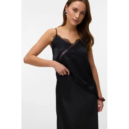 Deze zwarte singlet van VERO MODA is een veelzijdige basic met een vrouwelijke twist. De VERO MODA Vmnovi Lace singlet combineert een soepele, satijnachtige stof met verfijnde kantdetails. De V-hals en spaghettibandjes zorgen voor een luchtige uitstraling, terwijl de asymmetrische lijnen de top net wat spannender maken. Ideaal voor dagen waarop je zonder moeite een verzorgde look wilt.Verfijnde details voor elke dag Zwarte singlet met effen dessin, makkelijk te combineren met jeans, pantalon of rok V-hals met kant langs de halslijn voor een elegante uitstraling Spaghettibandjes voor een subtiel en luchtig effect Asymmetrische vormgeving voor een moderne look Geweven, gladde stof met satijnachtige glans die soepel langs het lichaam valt Valt normaal in de maat, waardoor je gewoon je gebruikelijke maat kunt kiezen Praktisch in onderhoud: wasbaar op 30 graden en lauw strijkbaar Niet geschikt voor de droogtrommel, zo blijft de stof mooi van structuurVan werkdag tot avond uitDeze top uit de 'Daily' collectie leent zich goed voor verschillende momenten. Combineer met een blazer voor een nette werkdag, of draag de singlet op een skinny jeans met hakken voor een avond uit. De zwarte kleur maakt stylen eenvoudig, terwijl het kant en de glans direct zorgen voor een aangeklede uitstraling.VERO MODA, stijlvol en toegankelijkVERO MODA staat bekend om modieuze items die goed aansluiten op het dagelijks leven. De collecties zijn ontworpen met oog voor actuele trends en draagbaarheid. Met deze singlet voeg je een betrouwbaar en stijlvol kledingstuk toe aan je garderobe, waar je het hele seizoen plezier van hebt.Een elegante basic die moeiteloos met je mee beweegt, van casual moment tot speciale gelegenheid.