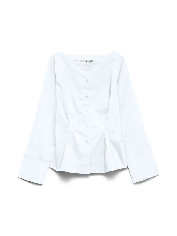 Blouse type: Klassieke blouse; Design: Gevoerde zoom/rand, Knop placket, Knop sluiting; Type sluiting: Knoopsluiting; Materiaal: Katoen; Motief: Effen; Kraag: Zonder kraag; Details: Plooien; Extra's: Op staal naden; Pasvorm: Slanke pasvorm; Armlengte: Lange mouw; Lengte: Normale lengte