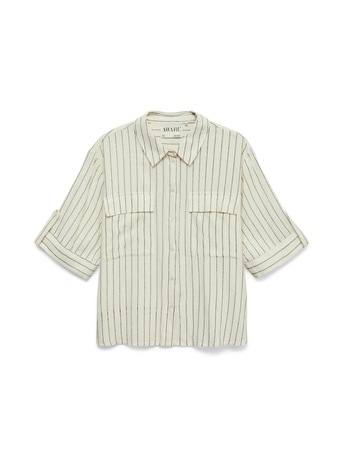 Blouse type: Klassieke blouse; Design: Borstzak, Roll-up mouwen; Type sluiting: Knoopsluiting; Materiaal: Viscose; Motief: Krijtstrepen; Kraag: Kentkraag; Details: Plooien; Extra's: All-over patroon, Gladde stof, Lichte stof; Pasvorm: Losse pasvorm; Armlengte: Halve mouw; Lengte: Normale lengte