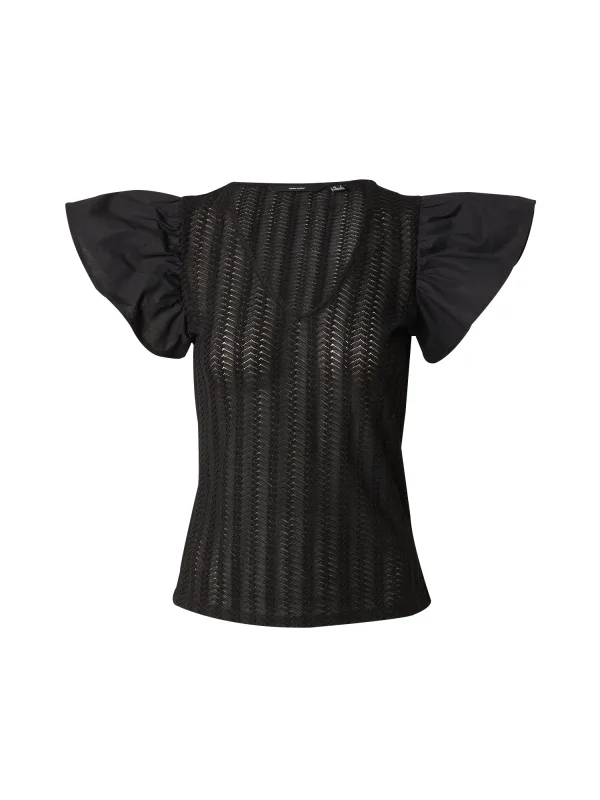 Blouse type: Blouseshirt; Design: Gevoerde zoom/rand, Rechte zoom; Materiaal: Gerecycled materiaal; Halstype: V-hals; Motief: Effen; Kraag: Zonder kraag; Details: Borduursels, Volant, Gedrapeerd, Mesh; Extra’s: Op staal naden, Voelt zacht aan; Pasvorm: Slanke pasvorm; Armlengte: Kwartmouw; Lengte: Normale lengte