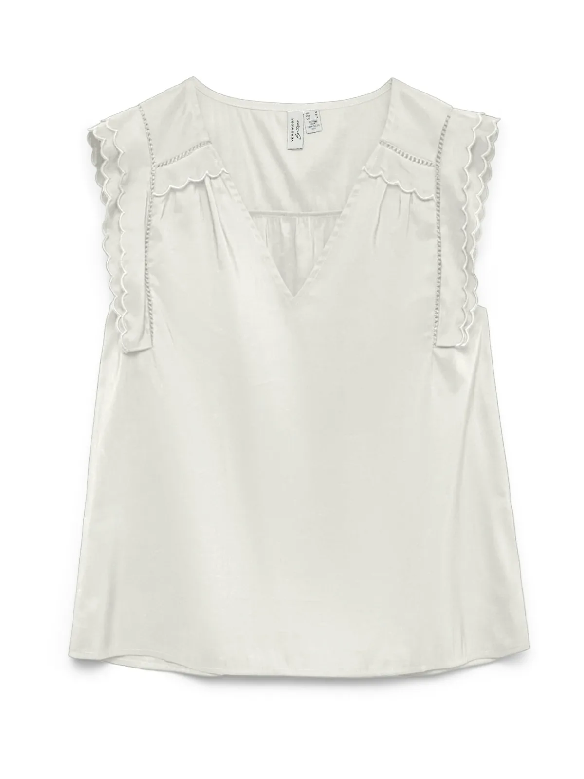 Blouse type: Blouseshirt; Design: Gevoerde zoom/rand, Rechte zoom; Materiaal: Viscose; Motief: Effen; Kraag: Zonder kraag; Details: Kant, Volant, Gedrapeerd; Extra's: Op staal naden, Gladde stof; Pasvorm: Normale pasvorm; Armlengte: Mouwloos; Lengte: Normale lengte