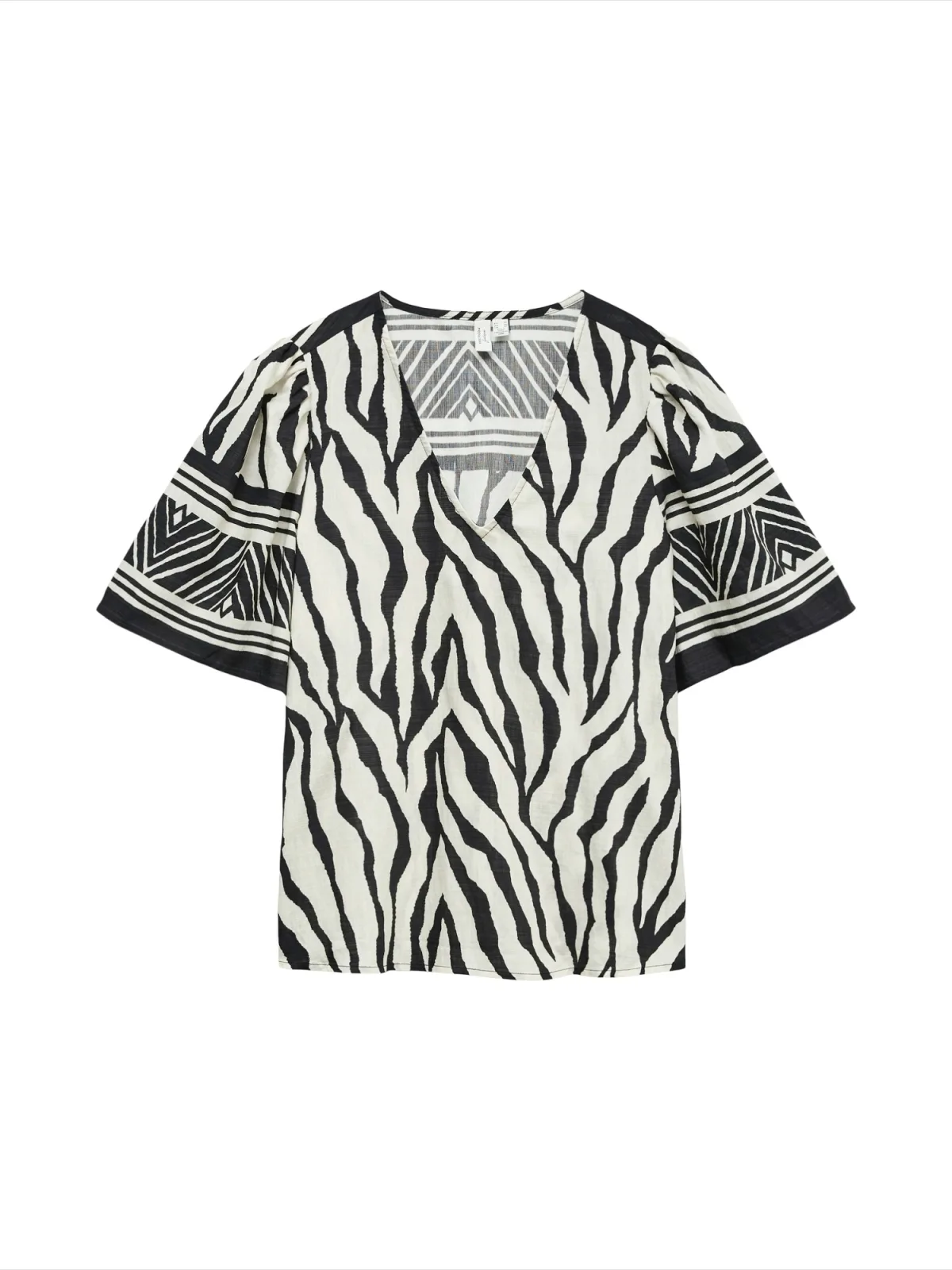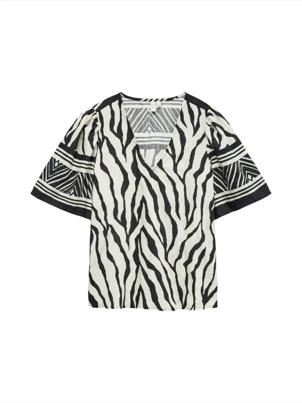 Blouse type: Blouseshirt; Design: Gevoerde zoom/rand, Rechte zoom, Pofmouwen; Materiaal: Viscose; Motief: Dierenprint; Kraag: Zonder kraag; Details: Gedrapeerd; Extra's: All-over patroon, Gladde stof; Pasvorm: Losse pasvorm; Armlengte: Halve mouw; Lengte: Normale lengte