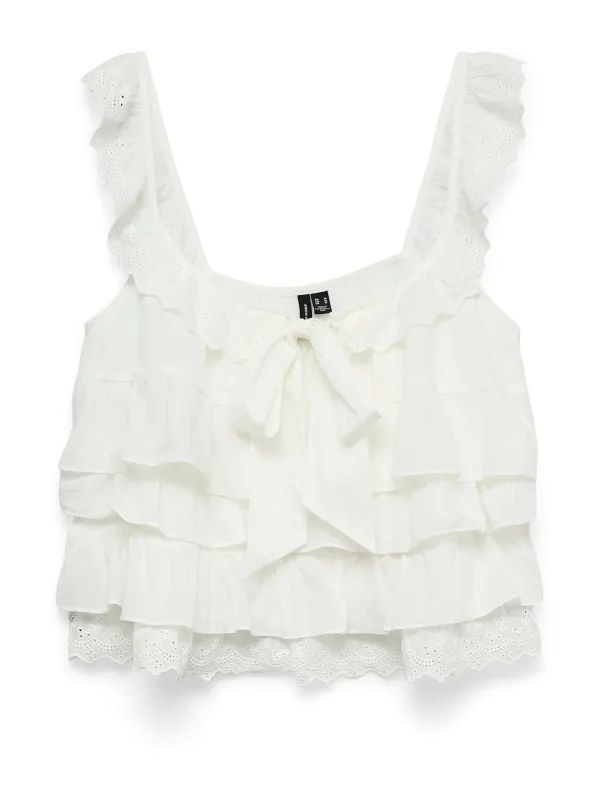 Blouse type: Blouseshirt; Design: Diepe snit/decolleté, Geschulpte zoom; Materiaal: Katoen; Motief: Effen; Details: Ruches, Borduursels, Volant; Extra's: Op staal naden, Zacht opgeruwde binnenkant, Met textuur; Pasvorm: Normale pasvorm; Armlengte: Mouwloos; Lengte: Normale lengte