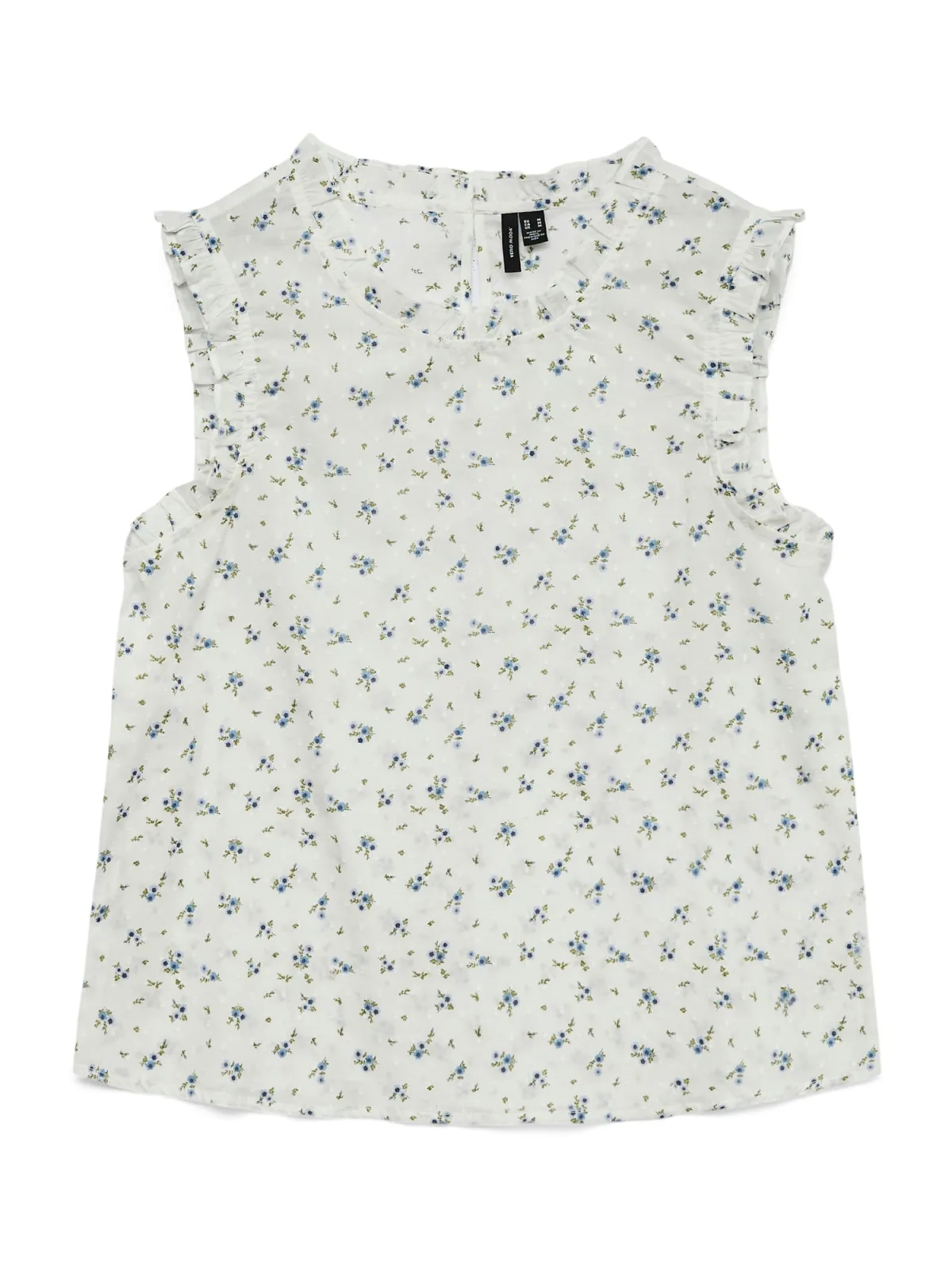 Blouse type: Blouseshirt; Design: Gevoerde zoom/rand, Rechte zoom, Keyholesluiting; Type sluiting: Knoopsluiting; Materiaal: Katoen; Motief: Bloemenprint; Kraag: Zonder kraag; Details: Cut-outs, Ruches; Extra's: All-over patroon, Voelt zacht aan; Pasvorm: Normale pasvorm; Armlengte: Mouwloos; Lengte: Normale lengte