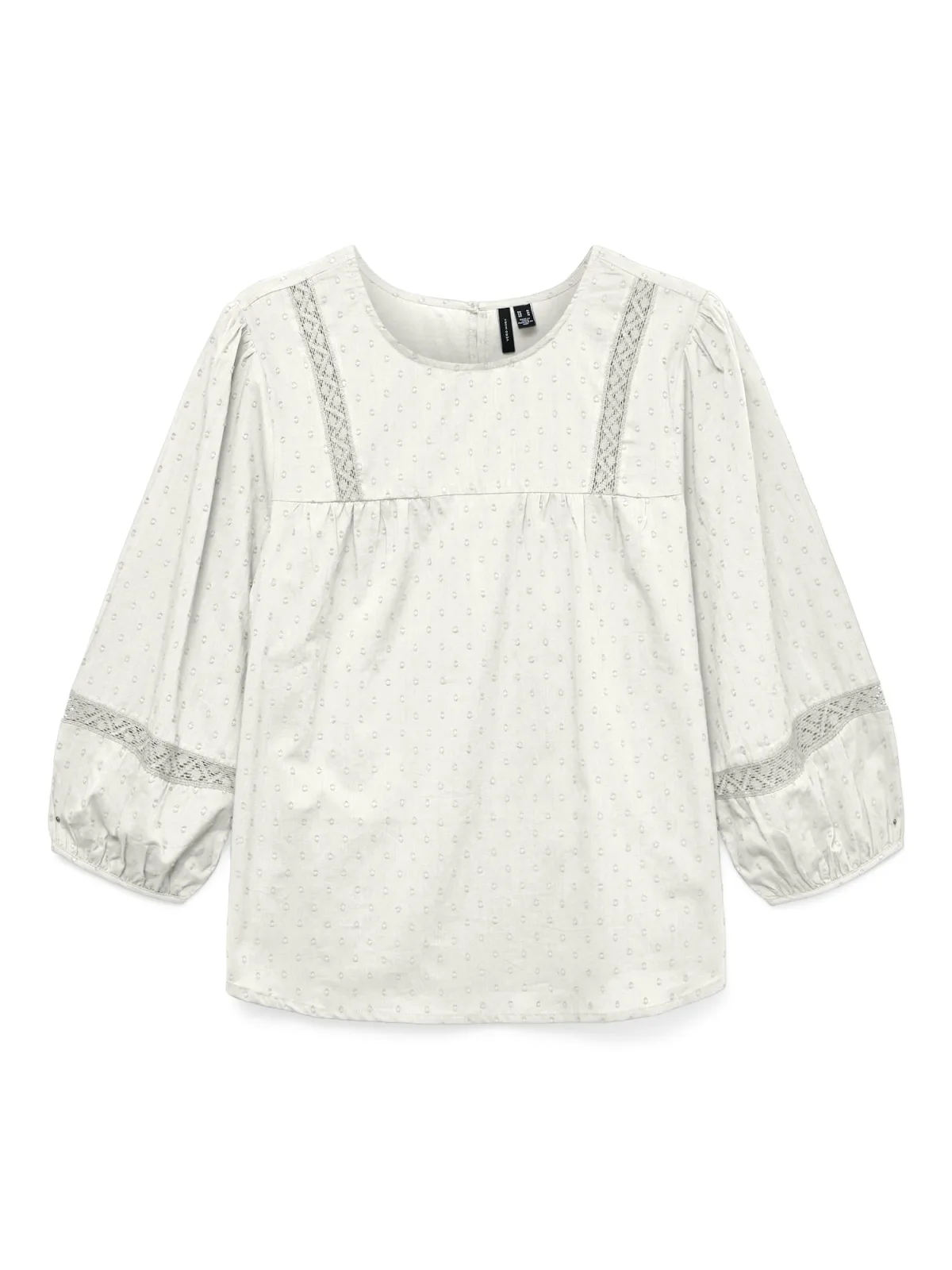 Blouse type: Blouseshirt; Design: Keyholesluiting, Pofmouwen, Ronde zoom; Type sluiting: Knoopsluiting; Materiaal: Katoen; Motief: Effen; Kraag: Zonder kraag; Details: Cut-outs, Kant, Gedrapeerd; Extra's: Op staal naden, Lichte stof; Pasvorm: Losse pasvorm; Armlengte: Driekwart mouw; Lengte: Normale lengte