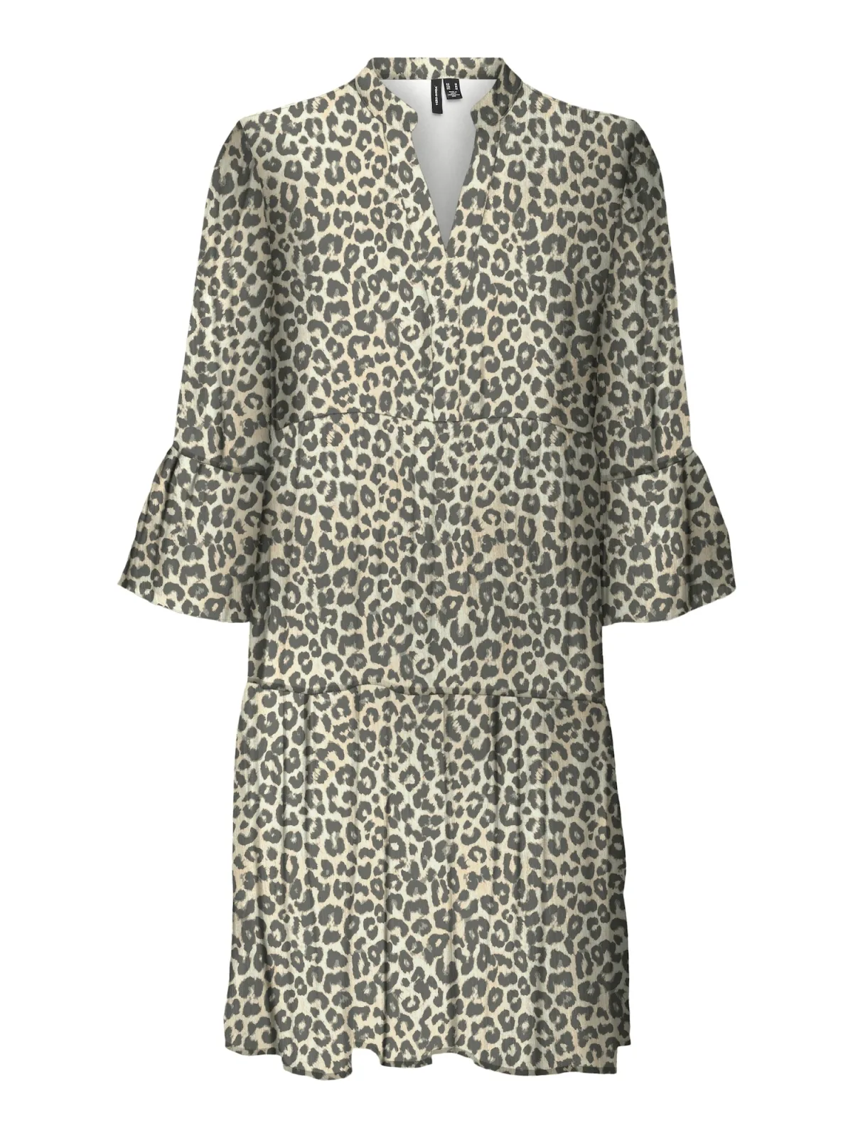 Design: Gevoerde zoom/rand, Flare; Halstype: Opstaande kraag; Motief: Dierenprint; Kraag: Tuniek kraag; Details: Volant, Gedrapeerd; Extra's: All-over patroon, Gladde stof; Lengte: Kort/mini; Snit: Recht; Pasvorm: Losse pasvorm; Armlengte: Driekwart mouw