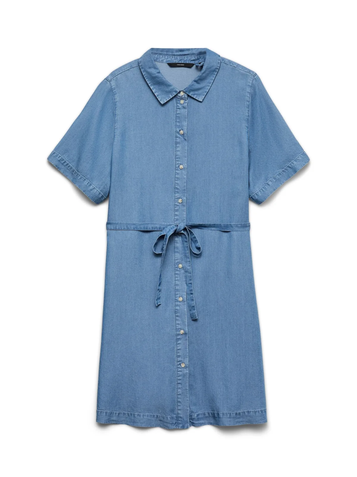 Dames denimjurk van Vero Moda;Model 'Bree';look: denim;pasvorm: getailleerd;Lengte: mini;hals: V-hals;Sluiting: knoopsluiting;mouwvorm: korte mouw;Materiaal: lyocell