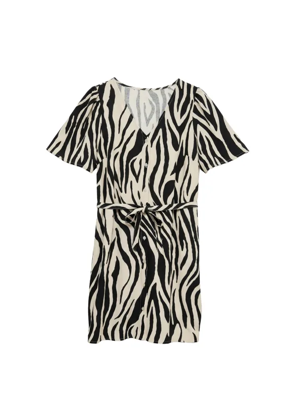 Design: Gevoerde zoom/rand, Knop placket, Met band/snoer; Type sluiting: Knoopsluiting; Materiaal: Viscose; Halstype: V-hals; Motief: Dierenprint; Kraag: Zonder kraag; Details: Gedrapeerd; Extra's: All-over patroon, Gladde stof; Lengte: Kort/mini; Snit: Getailleerd; Pasvorm: Normale pasvorm; Armlengte: Kwartmouw