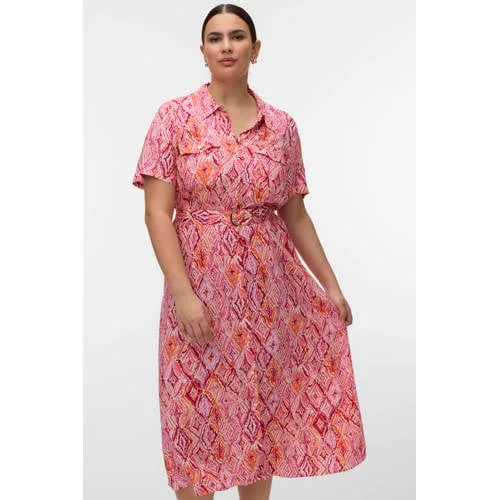 Zoek je een luchtige zomerjurk die geschikt is voor dagelijks gebruik, dan is deze VERO MODA CURVE blousejurk met ceintuur een praktische keuze. De jurk is speciaal ontworpen voor het grote maten assortiment en heeft een middellange lengte, korte mouwen en een klassieke kraag. De roze/oranje all over grafische print zorgt voor een duidelijke, zomerse uitstraling.Details die het verschil maken Blousejurk met knoopsluiting over de hele voorkant Middellange lengte, ideaal voor warme dagen Korte rechte mouwen voor extra bewegingsvrijheid Afneembare ceintuur in de taille voor een verstelbare pasvorm Praktische borstzakken als subtiel detail Gemaakt van 100% viscose, een soepele stof met fijne, zachte touch Zomerse kleurcombinatie in roze/oranje met grafische all over print Valt volgens maatadvies normaal Wasbaar op 30 graden en lauw strijkbaar (1 punt) Niet drogen in de droogtrommel om de stof goed te houdenCasual zomerjurk voor elke dagDeze jurk past goed in een dagelijkse garderobe. Draag de ceintuur strakker voor meer tailleaccent of wat losser voor een rechte, ontspannen pasvorm. De luchtige stof en korte mouwen maken de jurk geschikt voor zomerse dagen, zowel naar je werk als in je vrije tijd.VERO MODA CURVE: pasvorm in grotere matenVERO MODA CURVE richt zich op moderne kleding in grotere maten, met aandacht voor pasvorm en draagcomfort. De collectie sluit aan op de herkenbare stijl van VERO MODA en biedt actuele modellen die prettig aanvoelen en eenvoudig te combineren zijn met je bestaande garderobe.Een luchtige zomerjurk die je gemakkelijk aantrekt en waarmee je in één keer klaar bent.