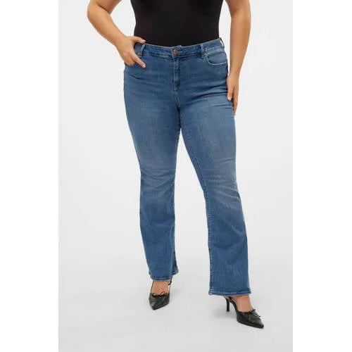 Deze VERO MODA CURVE VMCFLASH MR FLARED JEANS heeft een regular waist en een rits- en knoopsluiting. De jeans is lang, heeft riemlussen en vijf broekzakken, de pijpen lopen wijd uit.