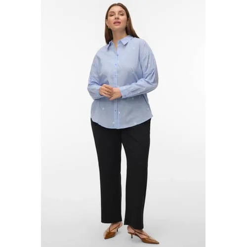 Deze lichtblauwe katoenen blouse van VERO MODA CURVE is een frisse basic voor elke dag, met net dat beetje extra door de subtiele geborduurde bloemen. Het luchtige materiaal van 100% katoen voelt soepel aan op de huid en maakt de blouse geschikt voor het hele seizoen, van de eerste lentedagen tot frisse zomeravonden. De klassieke kraag en lange rechte mouwen geven een tijdloze uitstraling, terwijl de lichtblauwe kleur makkelijk combineert met je favoriete jeans of een nette broek.Details die je elke dag wilt dragen Gemaakt van 100% katoen voor een zachte, ademende touch Lichtblauwe kleur met fijne bloemen borduursels voor een frisse look Lange rechte mouwen, comfortabel en geschikt voor verschillende gelegenheden Klassieke kraag en volledige knoopsluiting aan de voorkant Geen zakken voor een rustige, cleane voorkant Onderdeel van de Daily collectie, ideaal voor dagelijks gebruik Maatadvies: dit artikel valt normaal Wasbaar op 30 graden, warm strijkbaar (2 punten) en niet in de droogtrommel drogenVeelzijdig voor werk en vrije tijdOf je nu naar kantoor gaat, een lunchafspraak hebt of een casual dag plant, deze blouse past zich moeiteloos aan. Combineer met een donkere denim voor een ontspannen look of met een nette pantalon voor een meer geklede outfit.VERO MODA CURVE: eigentijdse stijl in grotere matenVERO MODA CURVE biedt modieuze kleding in grotere maten, met aandacht voor pasvorm en draagcomfort. De ontwerpen sluiten aan op de trends uit de reguliere VERO MODA collectie, zodat je keer op keer kunt kiezen voor eigentijdse items waarin je je comfortabel voelt.Een blouse om vaak uit de kast te pakken en makkelijk te stylen voor verschillende momenten op de dag.