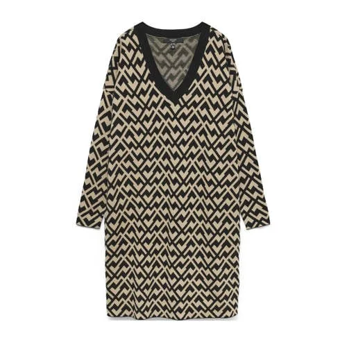 Design: Geribbelde kraag, Vleermuismouwen, Overcut schouder; Materiaal: Knitwear; Halstype: V-hals; Extra's: All-over patroon; Lengte: Knielengte; Snit: Recht; Pasvorm: Wijde pasvorm; Armlengte: Lange mouw