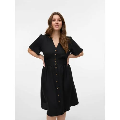 De VERO MODA CURVE midi jurk in zwart is een fijne basis voor elke dag, speciaal ontworpen voor een curvy pasvorm. De effen zwarte kleur en de middellange lengte geven een rustige uitstraling die je gemakkelijk aanpast aan jouw stijl. De soepel vallende, geweven stof volgt je bewegingen op een natuurlijke manier en voelt licht aan op de huid. Dankzij de V-hals en korte rechte mouwen oogt de jurk open en luchtig, ideaal voor het voorjaar en zomerse dagen.Details die je iedere dag dragen Middellange lengte die prettig rond de knie valt V-hals die het decolleté subtiel accentueert Knoopsluiting aan de voorkant voor eenvoudig aan en uit doen Geweven, soepele stof voor een lichte en comfortabele feel Effen zwarte kleur die makkelijk te combineren is Korte rechte mouwen voor een rustige, tijdloze look Valt normaal volgens het maatadvies, afgestemd op grote maten Praktisch in onderhoud, wasbaar op 30 graden en lauw strijkbaarVan werkdag tot weekendDeze midi jurk past goed bij dagelijkse momenten. Draag de jurk met sneakers op een drukke dag of met een nette schoen voor een meer geklede uitstraling. De rustige basis vraagt weinig styling en voelt daardoor ontspannen in gebruik.VERO MODA CURVE voor jouw pasvormVERO MODA CURVE richt zich op modieuze items in grote maten, met aandacht voor pasvorm en draagbaarheid. De collecties volgen de trends, maar blijven tegelijk toegankelijk en eenvoudig te combineren. Zo bouw je stap voor stap een garderobe op waar je lang plezier van hebt.Een comfortabele midi jurk die jouw dagelijkse outfits eenvoudig compleet maakt.