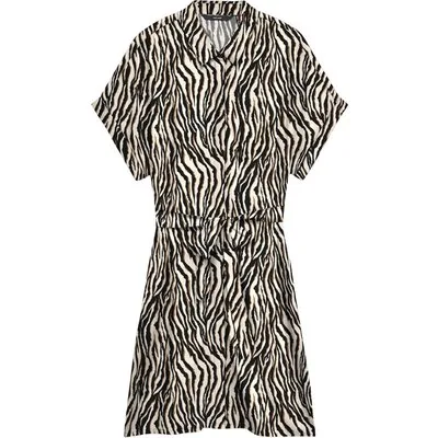 Specificaties: * Pasvorm: regular fit; korte mouwen; ceintuur rond de taille * Sluiting: sluiting met knopen * Manchetten: wijde mouwen; mouwuiteinden met omslag * Kleur: beige - zwart * Materiaal: 100% viscose