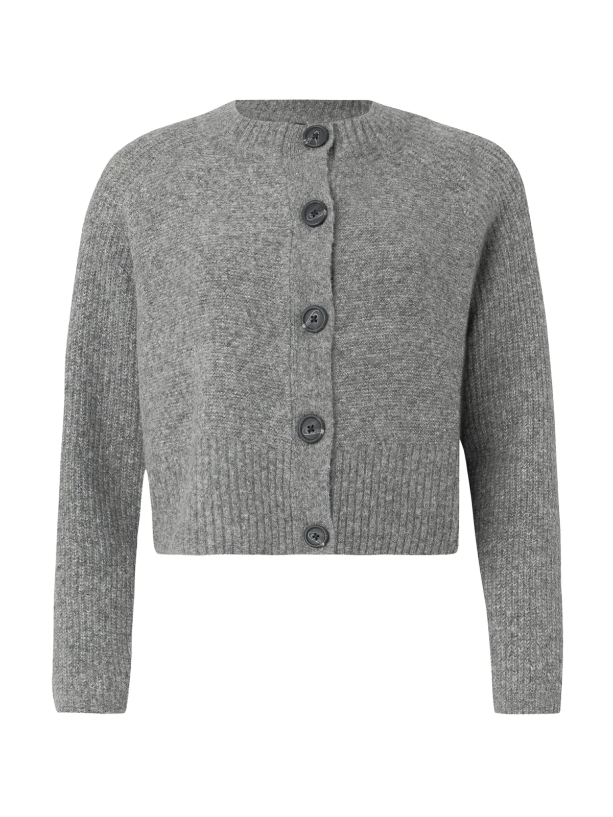 Design: Geribbelde kraag, Knop placket, Raglanmouwen, Geribd ceintuurtje; Type sluiting: Knoopsluiting; Materiaal: Gerecycled materiaal; Halstype: Ronde hals; Motief: Mélange; Extra's: Fully fashioned, Voelt zacht aan; Pasvorm: Normale pasvorm; Armlengte: Lange mouw; Lengte: Normale lengte